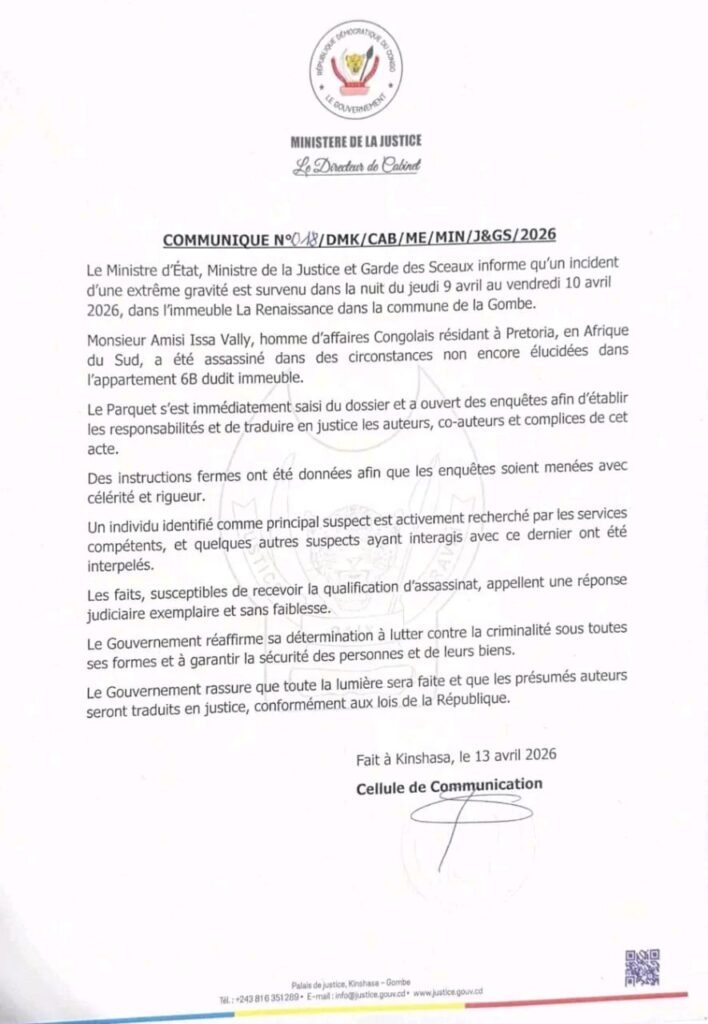 Le ministère de la Justice et Garde des Sceaux a, dans un communiqué officiel, confirmé l’assassinat de M. Amisi Issa Vally, homme d’affaires congolais résidant à Pretoria, en Afrique du Sud. Le drame s’est produit dans la nuit du jeudi 9 au vendredi 10 avril, à l’immeuble La Renaissance, situé dans la commune de la Gombe, à Kinshasa.