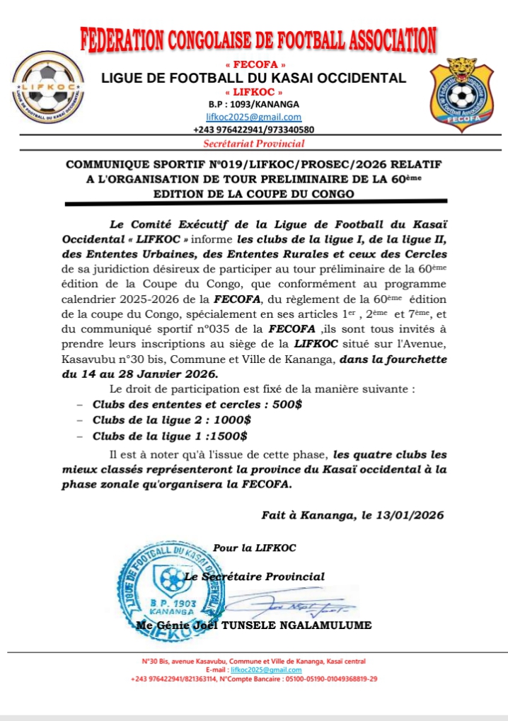 La Ligue de Football du Kasaï Occidental (LIFKOC) a annoncé, à travers un communiqué sportif officiel, l’organisation du tour préliminaire de la 60ᵉ édition de la Coupe du Congo, conformément au calendrier sportif 2025-2026 de la Fédération Congolaise de Football Association (FECOFA).