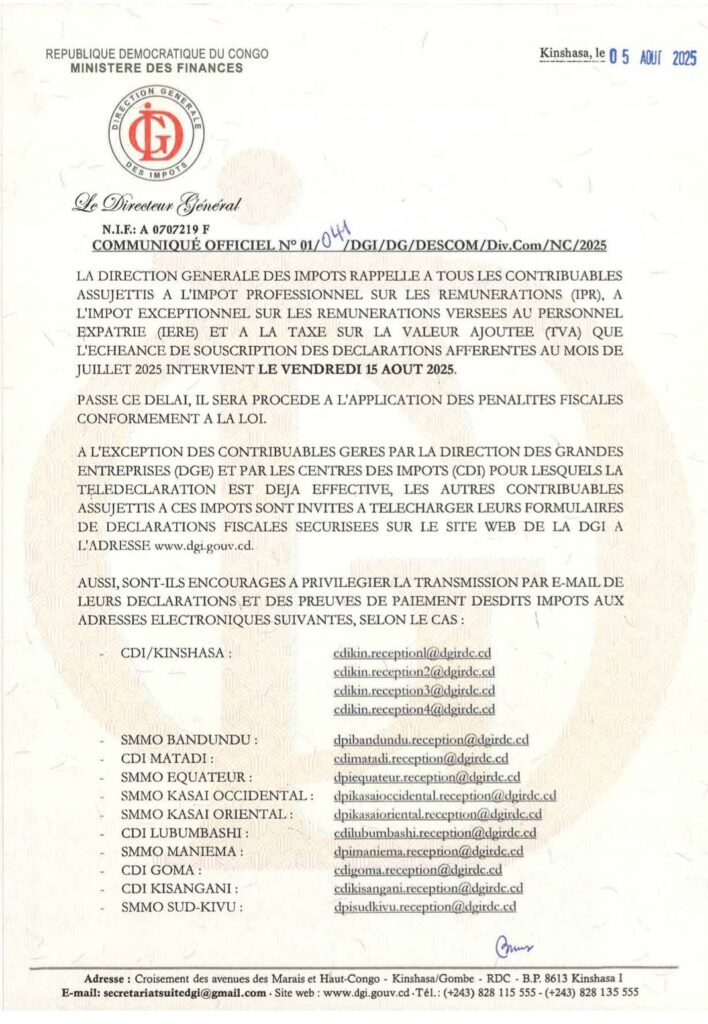 La Direction Générale des Impôts rappel à tous les contribuables assujetis à l’impôt professionnel sur les rémunérations (IPR), à l’impôt exceptionnel sur les rémunérations versées au personnel expatrié (IERE) et à la taxe sur la valeur ajoutée (TVA) que l’échéance des souscriptions des déclarations afférentes au mois de juillet 2025 intervient le vendredi 15 août 2025.