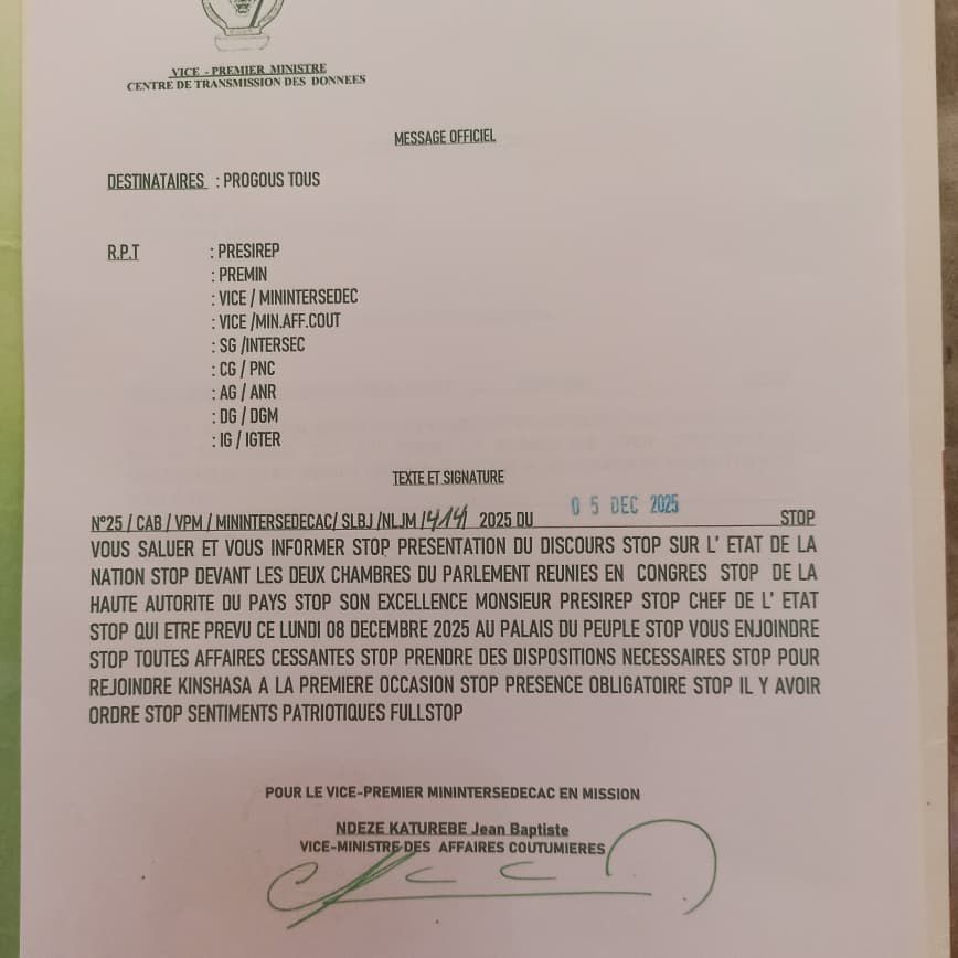 Ndeze Katurebe Jean Baptiste, Vice-ministre des Affaires coutumières, agissant au nom du Vice-Premier ministre, a adressé ce vendredi 5 décembre 2025 un message officiel à plusieurs hauts responsables des institutions et des services de sécurité du pays.