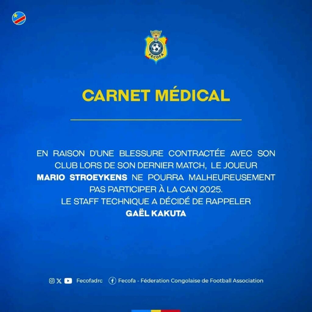 Face à cette absence, le staff technique des Léopards a décidé de rappeler Gaël Kakuta afin de renforcer l’effectif en vue de la compétition continentale. L’information a été rendue publique ce mercredi 17 décembre 2025 dans un communiqué de la Fédération congolaise de football association (FECOFA).