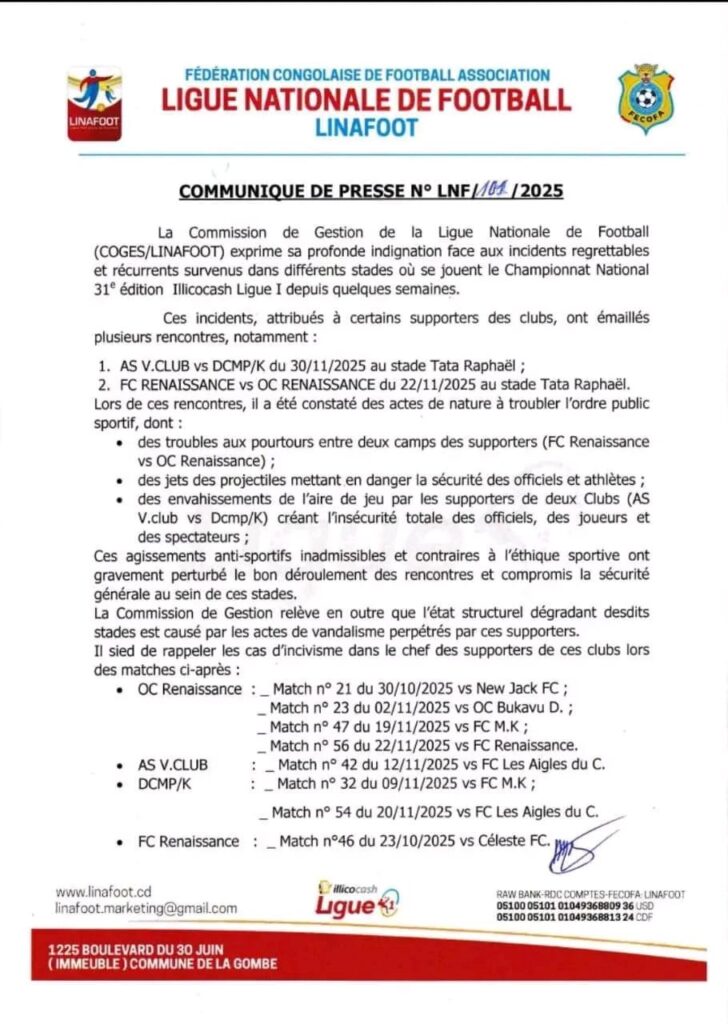 La Linafoot relève également la dégradation structurelle de plusieurs stades, conséquence directe d’actes de vandalisme commis à répétition par certains supporters. Le communiqué rappelle d’autres incidents survenus depuis octobre 2025 impliquant notamment OC Renaissance, AS V.Club, DCMP et FC Renaissance.