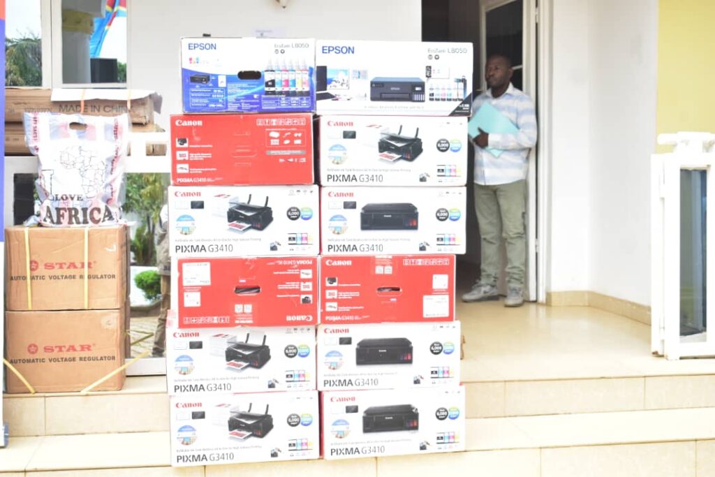 Le lot réceptionné est composé de 20 ordinateurs, 13 imprimantes, 2 stabilisateurs, 10 disques durs externes d’un téraoctet, 20 rallonges électriques adaptées, ainsi que du mobilier comprenant un salon, 4 tables de bureau, 10 tables simples, 10,armoires, 10 chaises tournantes et 48 chaises visiteurs.