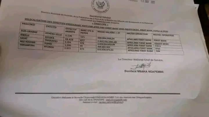Un document signé par le directeur national et chef de service, Boniface Mbaka Ngapembe, confirme le transfert de milliers d’enseignants vers de nouveaux établissements bancaires.