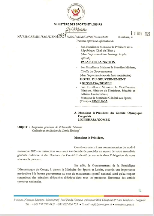Le gouvernement de la République démocratique du Congo a décidé de suspendre provisoirement les élections du Comité exécutif du Comité olympique congolais (COC), initialement prévues pour le vendredi 14 novembre 2025.