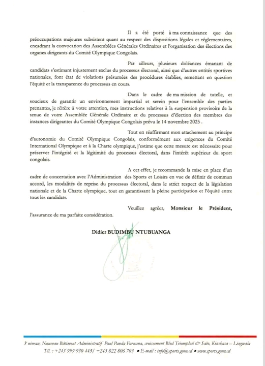 Dans sa lettre adressée au président du COC, le ministre a insisté sur la nécessité de garantir une bonne gouvernance du mouvement sportif congolais, en veillant au respect des principes d’équité et d’éthique dans toutes les élections sportives du pays.