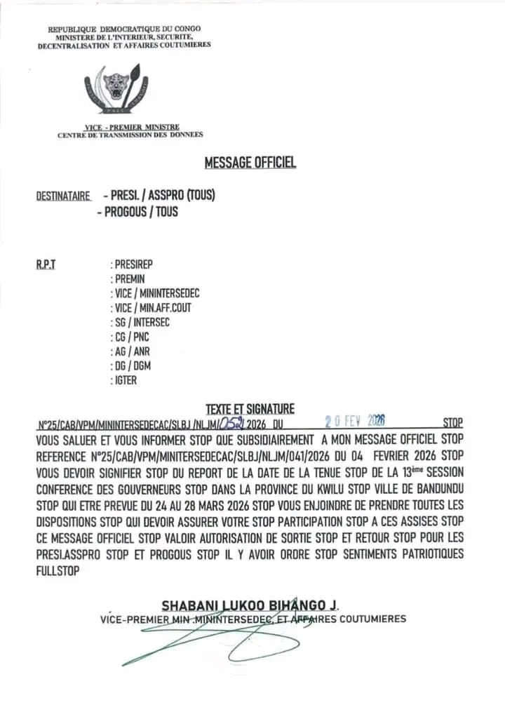 « Je vous salue et vous informe, subsidiairement à mon message officiel, du report de la tenue de la 13ᵉ session de la Conférence des gouverneurs dans la province du Kwilu, ville de Bandundu, initialement prévue du 24 au 28 mars 2026 », peut-on lire dans le document officiel.