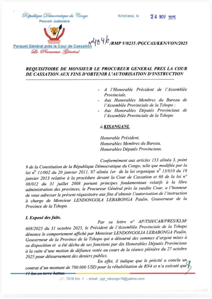 Le Procureur général près la Cour de cassation a saisi l’Assemblée provinciale de la Tshopo afin d’obtenir l’autorisation d’ouvrir une instruction judiciaire contre Paulin Lendongola Lebabonga, ancien gouverneur de la province.