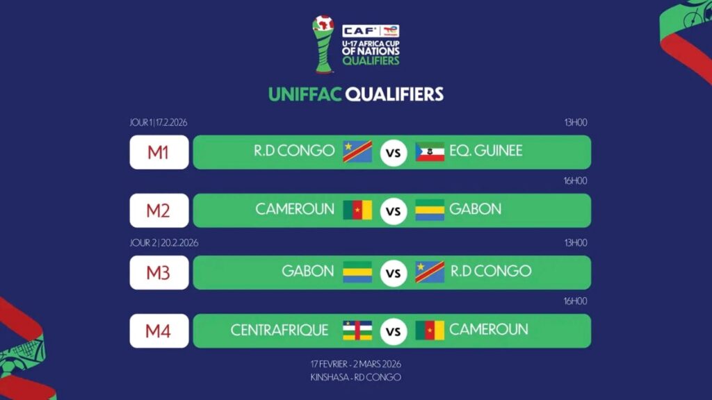La République démocratique du Congo entame officiellement sa campagne au tournoi zonal de l’Union des Fédérations de Football d’Afrique Centrale (UNIFFAC) U17, ce mardi 17 février 2026 à Kinshasa. Les jeunes Léopards visent l’unique billet qualificatif pour la prochaine Coupe d’Afrique des Nations U17 2026, prévue au Maroc du 30 mars au 19 avril 2026.